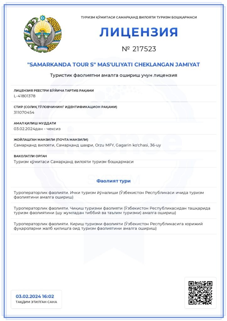 Organizza viaggi in Uzbekistan. Tour Uzbekistan offre itinerari dei viaggi in Uzbekistan marzo, aprile, maggio, giugno, luglio, agosto, settembre, ottobre. Organizza viaggi splendidi in Uzbekistan. Si trova a Samarcanda – citta’ antica e citta’ famosa dell’Asia Centrale. Esiste come una agenzia di viaggi e agenzia di trasporti dal 2006 con la Licenza n° 280-06. Ufficialmente dal 2008 è INCOMING TOUR OPERATOR. Dal 2019 MIGLIORE TOUR OPERATOR dell’Uzbekistan. Organizzatore ottimi viaggi in Uzbekistan con i suoi trasporti.