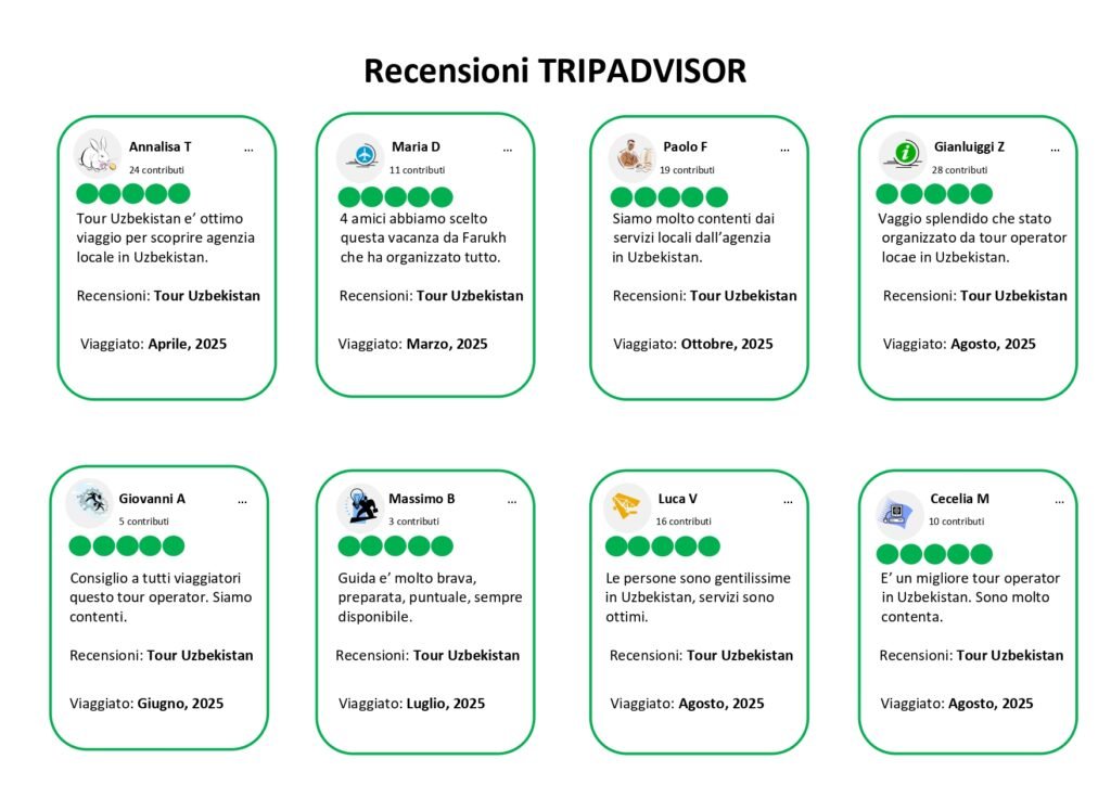 Per ottenere opinioni più dettagliate e recenti, potresti cercare recensioni online su piattaforme di viaggi, partecipare a forum dedicati o leggere blog di viaggi di persone che hanno visitato l’Uzbekistan di recente.